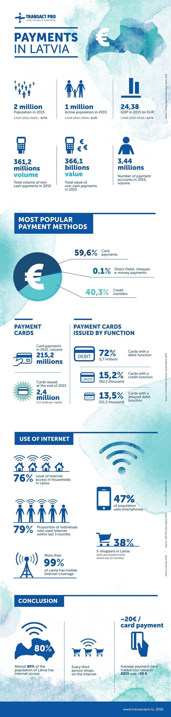 The most popular non-cash payment method in Latvia is debit cards representing 72% of the total number of payment cards issued.